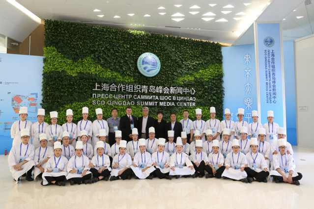 烹饪学院四位老师,特别抽调服务上合宴会服务。其中王桂云、王珊珊、姚金侠三位老师直接参与峰会各国元首6月9日青岛国际会议中心宴会厅欢迎晚宴的烹饪,邢文君老师指导和负责鲁商凯悦酒店峰会宴席接待中西面点出品。