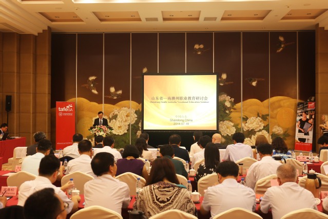 当日上午,山东省-南澳州职业教育研讨会在济南山东大厦举行,此次研讨会是应山东省政府邀请,李麒伟(David Ridway)率团访问山东期间的一项重要活动。山东省教育厅副厅长白皓、职业教育处处长梁斌言、国际交流与合作处处长江雨及我省24所职业院校的代表参加此次研讨会。会议期间,学院党委书记李达与南澳技术与继续教育学院院长李娜(Alex Reid)就深化两校合作深入交换了意见、达成广泛共识。学院党委副书记于敏在会上作了题为立足中澳职业教育国际合作,培养国际化服务型人才的发言。