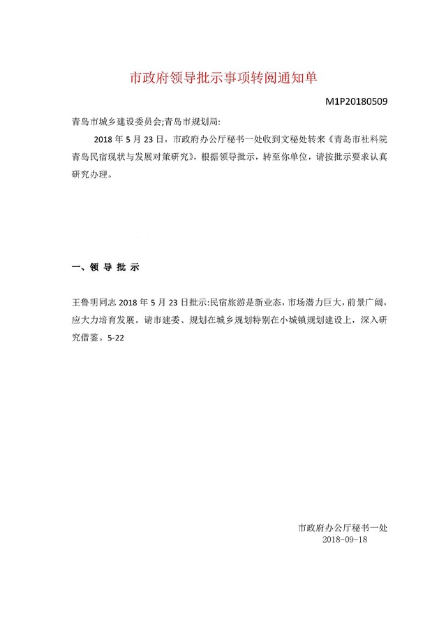 本网讯(科研发展处 魏有广)近日,从青岛市社科联传来消息,我院主持的青岛市“双百调研工程”课题“青岛民宿现状与发展对策研究”的研究报告分别获青岛市副市长栾新同志、青岛市原常务副市长王鲁明同志的肯定性批示,并由市政府办公厅转发市城乡建设委员会、市规划局、市社会科学院等部门研究阅办。