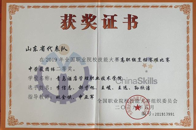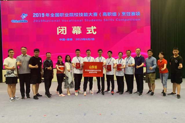 本网讯(烹饪学院 李文武)5月30日至6月2日,2019年全国职业院校技能大赛(高职组)烹饪赛项比赛在广东顺德职业技术学院举行,学院选派李信志、郝才旭、王峻、王远和孙欣洁等五名同学组队参赛并获得团体二等奖。