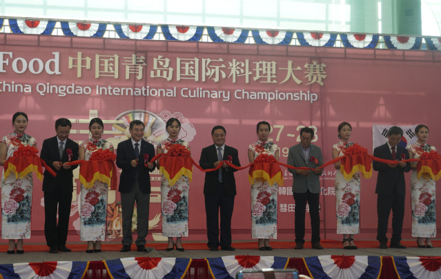 在热烈的掌声中,与会领导为“2019 K-food中国青岛国际料理大赛”剪彩。