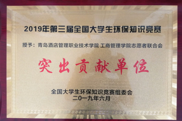 本网讯(工商管学院 孙康)日前,在2019年第三届全国大学生环保知识竞赛中,工商管理学院组织动员千余名大学生参与线上竞赛,取得优异成绩,工商管理学院志愿者联合会被授予突出贡献单位。