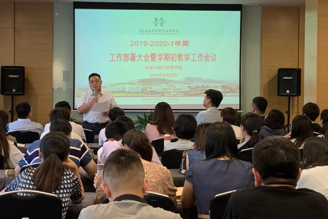 本网讯(旅游与酒店管理学院 刘芬)8月23日下午,旅游与酒店管理学院在旅游与酒店管理实训中心多功能厅召开2019-2020学年第一学期工作部署大会暨学期初教学工作会议,学院副院长刁洪斌、旅游与酒店管理学院管理团队及全体教职工参加会议。