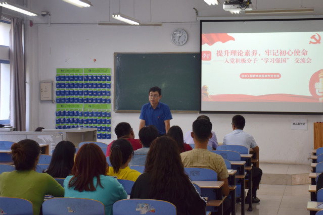 本网讯(信息工程技术学院 郭光武)近日,信息工程技术学院学生党支部结合“不忘初心、牢记使命”主题教育,开展入党积极分子交流活动,入党积极分子代表赵玉峰、王境珠、卢雨蝶、李鑫等四名同学做了思想汇报交流。
