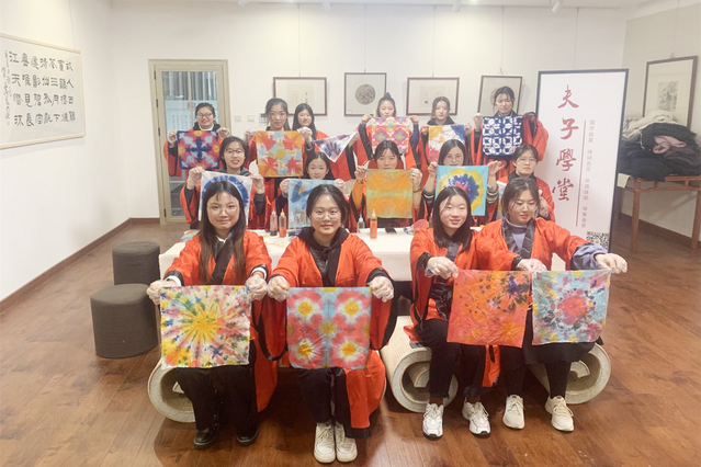 活动从“拜孔礼”开始。同学们穿上传统汉服,整肃衣冠,对着先师孔子画像鞠躬行礼,通过庄严而恭敬的仪式,让学生表达对老师的恭敬心,对学业的上进心,感知传统仪式背后的郑重,体悟并传承传统礼仪文化。在非遗体验环节,同学们学习了扎染艺术。扎染是我国一种古老的防染工艺,它先将织物进行捆扎,然后进行染色,在染色过程中根据被捆扎的织物所受轻重、松紧压力的不同,染成的图案纹样简洁质朴、神奇多变,有令人惊叹的艺术魅力。在夫子学堂老师们的带领下,学生们纷纷动手操作,完成了一幅幅图案漂亮、色泽饱满的方巾作品。