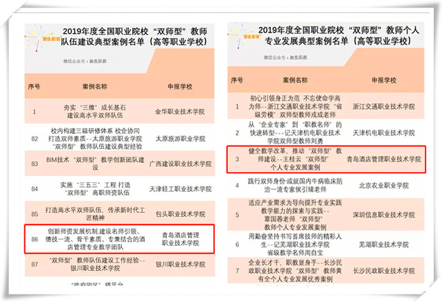 学院《创新师资发展机制,建设名师引领、德技一流、骨干素质、专兼结合的酒店管理专业教学团队》入选“双师型”教师队伍建设典型案例、《健全教学改革,推动“双师型”教师建设——王桂云“双师型”个人专业发展案例》入选“双师型”教师个人专业发展典型案例。