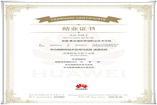 此次实训,华为公司为我院物联网学子开设网络平台专区,课程基于华为“Ocean Connect” 平台深入剖析了物联网技术的最新应用场景,突破“疫情”局限,给学生提供了在线实训的良机。学院组织了2018级物联网应用技术专业学生及2019级计算机应用专业群的优秀学生共计100人参加。经过考核,97人通过所有测试拿到了华为“物联网技术应用与实践”课程认证证书,通过率97%,其中优秀率达45%。