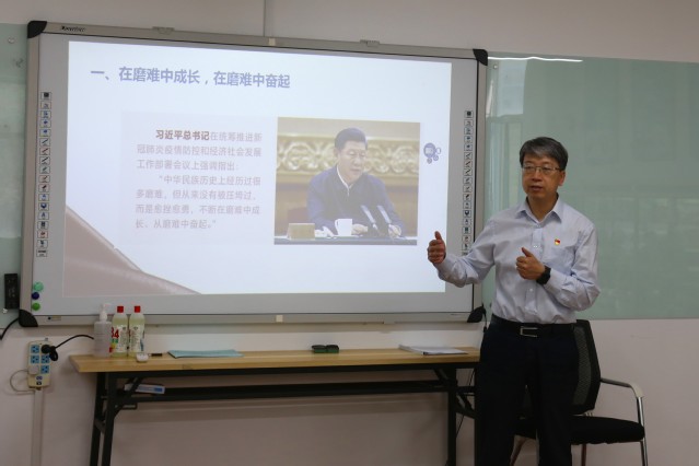 宫恩龙以“众志成城抗疫情”为题,与同学们一起回顾了抗疫期间的抗疫故事和抗疫感悟,本次疫情抗击充分体现了中国精神、中国力量和中国速度,展现了中国特色社会主义制度集中力量办大事的显著优越性。他嘱托同学们珍惜来之不易的校园生活,树立学院主人翁意识,积极配合学院管理,当好老师的好助手,维护校园安全稳定,要养成良好卫生习惯,做到戴口罩、勤洗手、常通风,不信谣、不传谣、不造谣,确保身心健康和生命安全,做到全院上下众志成城,共同打赢疫情防控阻击战。
