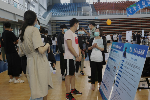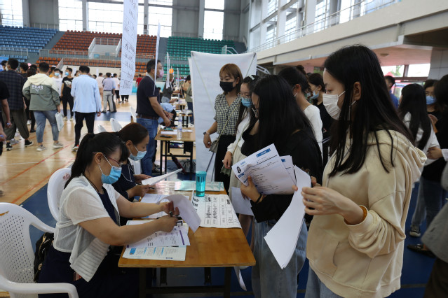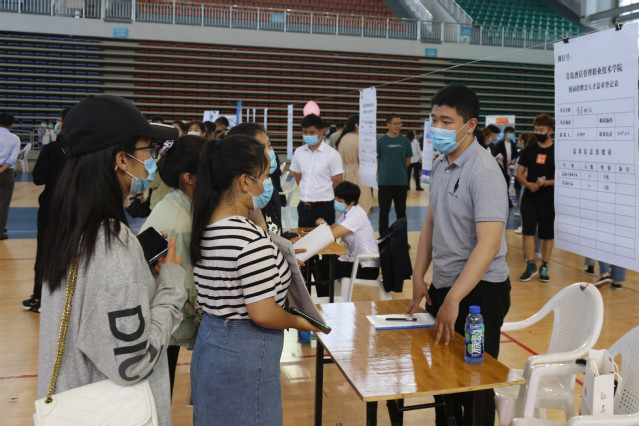 本网讯(招生就业办公室 张承业)6月23日,学院2020年实习就业校园现场招聘会在体育馆举办,学院为返校学生精准邀请了中国邮政集团公司、山东法尔消防科技有限公司、青岛特锐德电气股份有限公司、青岛大剧院、中联建业集团、青岛东方影都希尔顿酒店等34家企业单位,提供3000余个实习就业岗位。