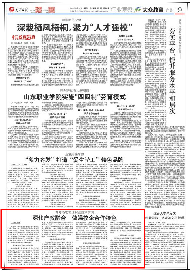 依托专业群与现代服务业头部企业联合成立山东文旅产业学院等8个产业学院。校企共同制定民宿管理与运营、研学旅行管理与服务两个专业国家教学标准。牵头修订旅游管理等山东省职业教育专业教学指导方案5项。联合推进专业数字化转型升级,根据新版专业目录和参与制定的国家专业教学标准,围绕酒店主要业务领域,结合学分制改革,重塑全校课程体系,全部专业课实现项目化教学和教学资源重构,课程建设与产业需求紧密对接。与华住集团合作打造数字化酒店实训基地,与阿里巴巴菜鸟网络共建智慧物流末端综合实训基地,通过搭建专业群产教融合实训基地,打造育训结合人才培养模式。(王超 陈赞)