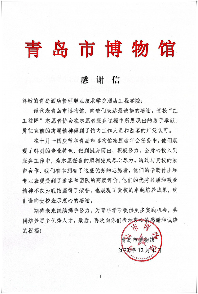 本网讯(酒店工程学院 周长龙)逐梦启航,志愿同行。12月4日上午,青岛市博物馆向万象城官网发来感谢信,万象城官网对酒店工程学院“红工益匠”志愿者协会在国庆节和青岛市博物馆年会期间的辛勤付出给予高度评价。