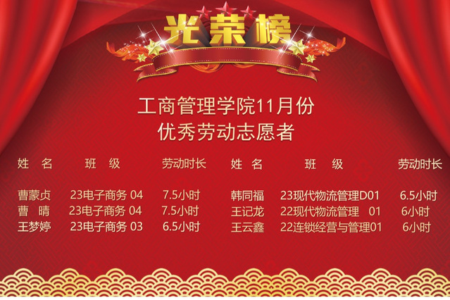 为推动劳动志愿服务的制度化与常态化,工商管理学院制定了《劳动志愿者管理办法》,将宿舍内务、教室卫生、环境卫生、集体劳动等义务劳动和值班值日劳动时长实行量化管理,“用劳动换时长,用时长换荣誉,用荣誉换学分”。通过荣誉激励鼓励学生自觉参与劳动,激发学生劳动热情,增强学生在劳动中获得的身份认同感、组织归属感、实际获得感。