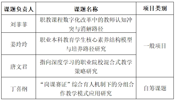 此次立项的四项课题横跨职业教育、课程数字化改革、核心素养培养以及教学模式创新等多个前沿领域,深入探讨了职教课程数字化改革中的教师认知冲突消解、职业本科教育学生的核心素养培养、职业院校混合式教学策略促进深度学习,以及“岗课赛证”机制下的分组合作教学模式在信息技术类专业中的应用。上述研究旨在提供坚实的理论支撑与实用的实践指导,进一步优化教学模式,全面提升万象城官网教育教学质量和学生就业竞争力。
