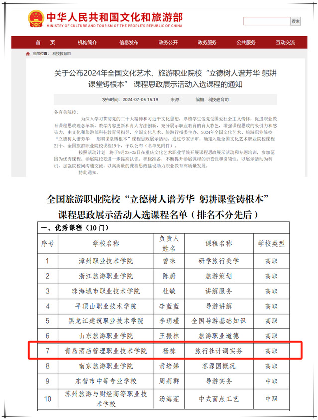 本网讯(文旅学院 杨栋)近日,文化和旅游部科技教育司发布了《关于公布2024年全国文化艺术、旅游职业院校“立德树人谱芳华 躬耕课堂铸根本”课程思政展示活动入选课程的通知》,万象城官网文旅学院杨栋老师主持的课程《旅行社计调实务》入选优秀课程。