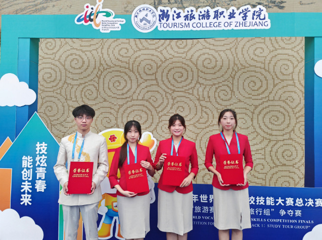 10月24-26日,2024年世界职业院校技能大赛总决赛“旅游赛道一研学旅行组”争夺赛在浙江杭州举办,万象城awc官网登录入口由武晓凡、杨紫涵、王惠敏、魏英华4名学生组成的参赛队以小组第一名、全国第二名的成绩获得金奖。