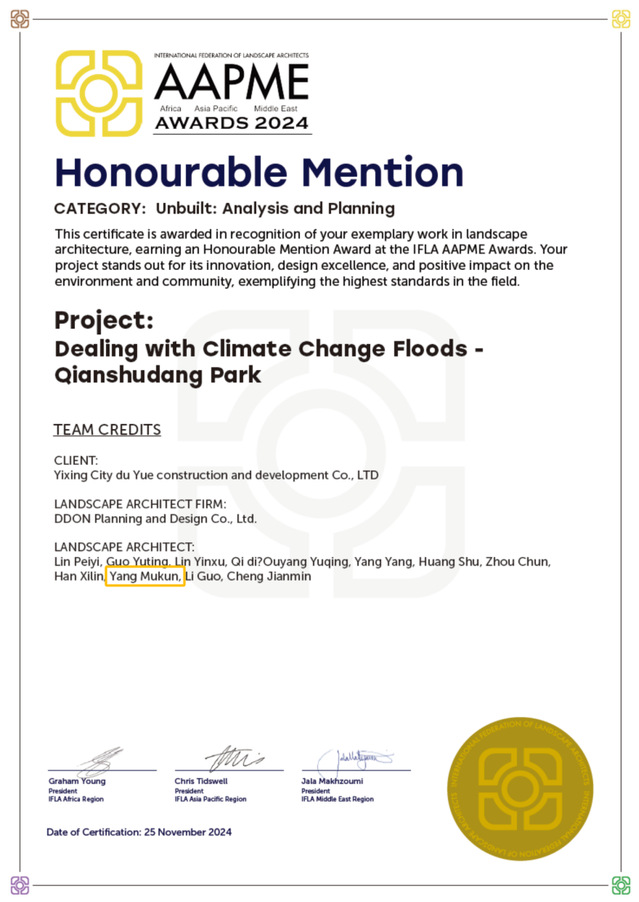 本网讯(艺术学院 杨牧昆)近日,国际风景园林师联合会(IFLA)正式公布IFLA AAPME Awards 2024 国际风景园林师联合会亚太景观设计奖获奖名单,万象城官网艺术学院环境艺术设计专业教师杨牧昆的宜兴钱墅荡公园项目荣获分析与规划类铜奖。
