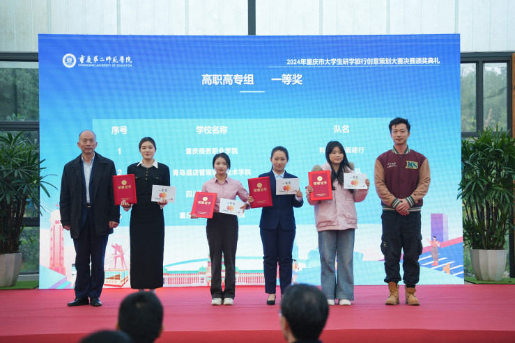本网讯(文旅学院 刘芬)近日,2024年重庆市大学生研学旅行创意策划大赛决赛在重庆落幕。学校文旅学院刘晓倩、于姗、刘晓宇、边晓雨等学生组成的参赛团队荣获高职高专组一等奖。